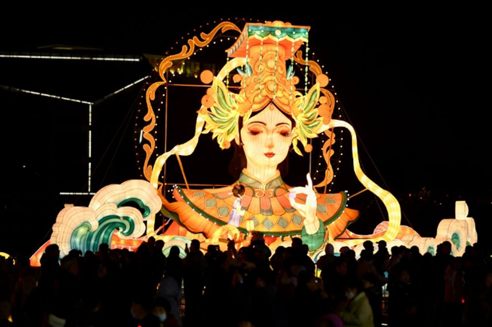 灯组中,一尊高9米的“妈祖”身前,穿着福州传统服饰的小姑娘站在一艘巨浪托起的小船上与之平静对望。