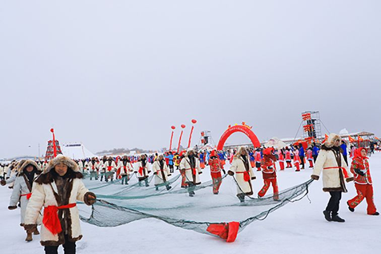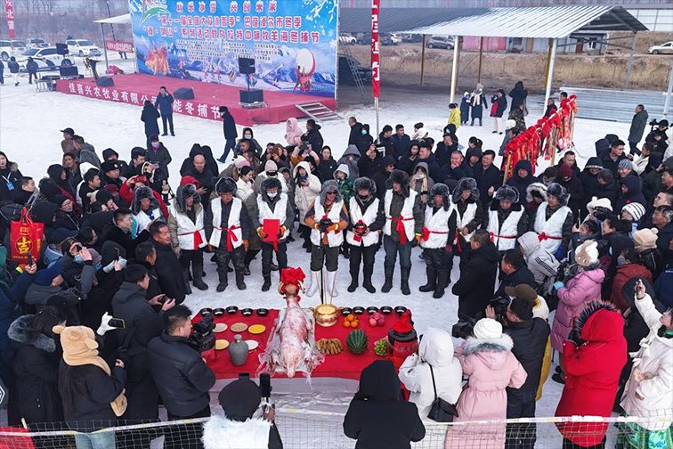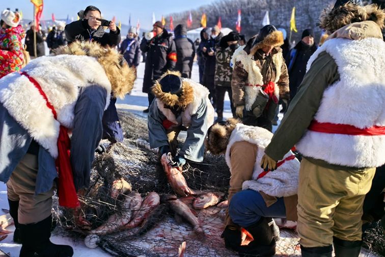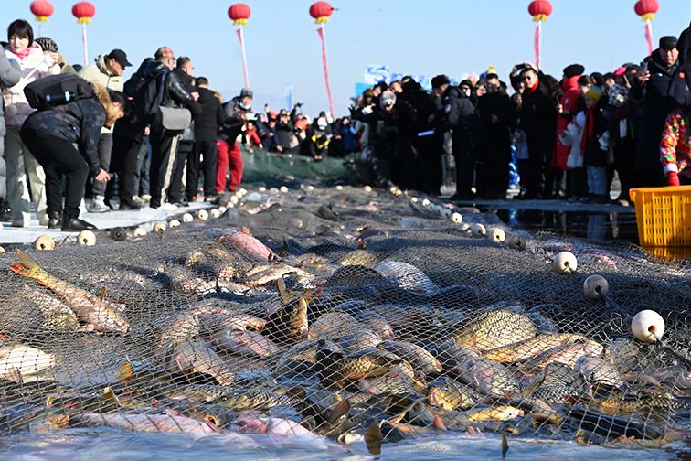 寒冬之际,中国迎来捕鱼季,多地冬捕活动纷纷开启,一片热闹之景呈现眼前。图为1月12日,2024黑龙江“冷水鱼·冬捕季”系列活动镜泊湖分会场盛大启幕,工人们捕捞出“新年第一网”。(央广网)