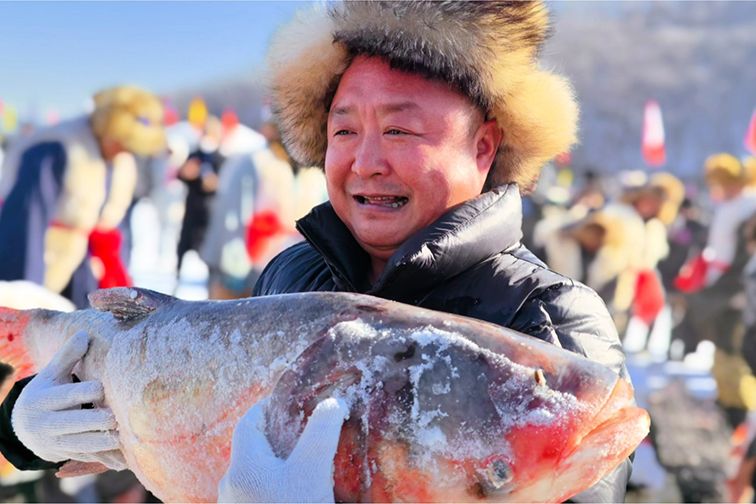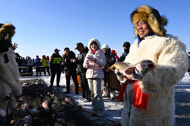 图为1月10日,内蒙古呼和浩特,鱼把头捧鱼送祝福。(中新社)