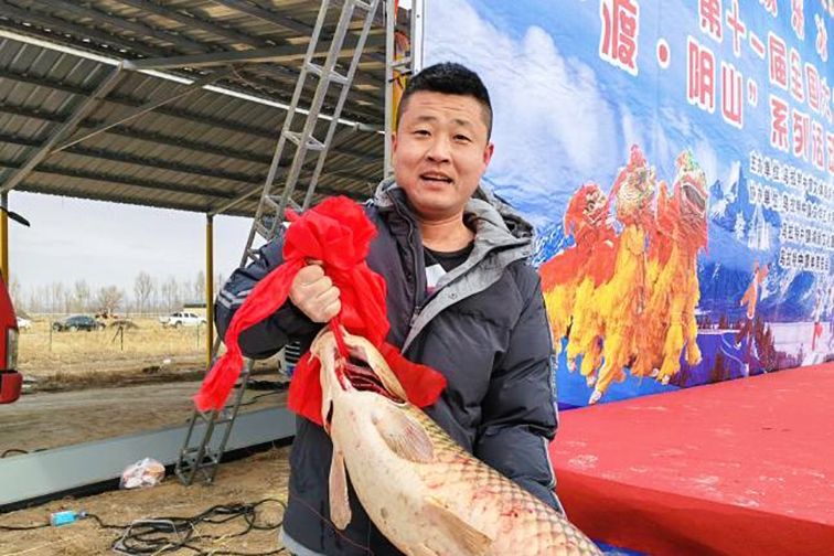 图为1月12日,内蒙古巴彦淖尔,欢乐冰雪共创未来“第十一届全国大众冰雪季”巴彦淖尔市冬季“渡·阴山”系列活动暨乌拉特中旗牧羊海冬捕节活动现场33斤重的头鱼。(中新社)