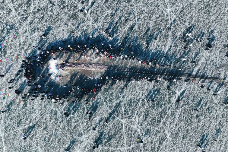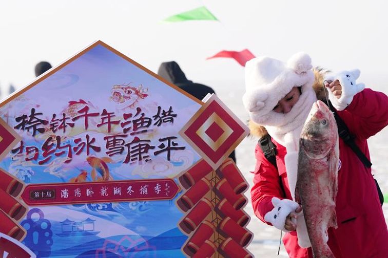图为1月11日,辽宁沈阳,游客在沈阳康平卧龙湖冬捕现场拍照打卡。(新华社)