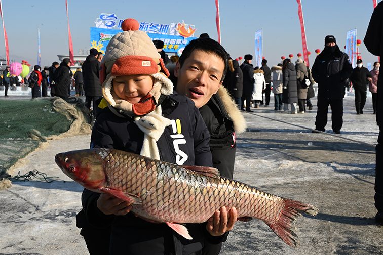 图为1月10日,内蒙古呼和浩特,哈素海第三届冬捕节开幕,儿童与冬捕鱼合影。(中新社)