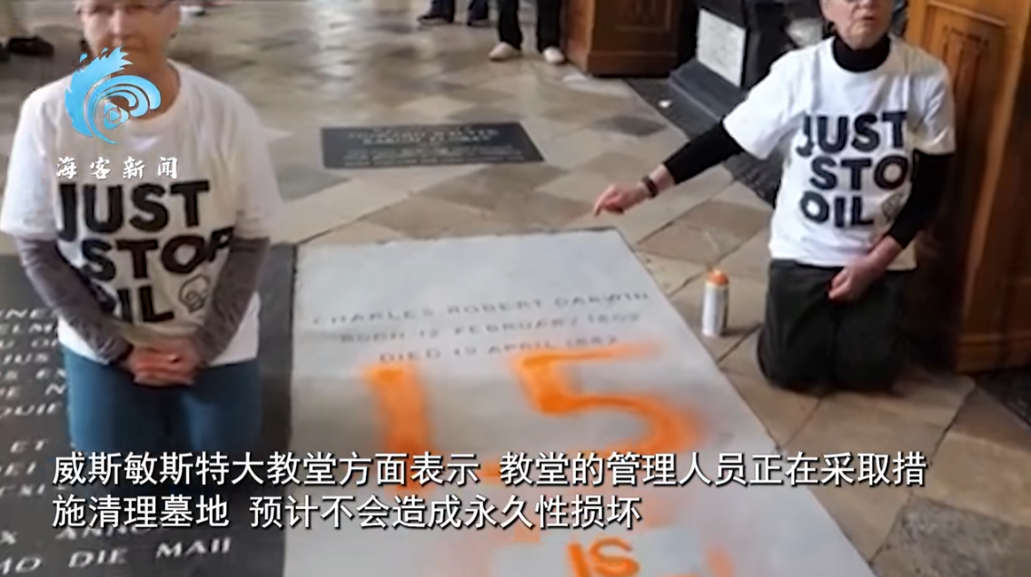 两名环保抗议者1月13日在伦敦威斯敏斯特大教堂的达尔文墓上喷漆,随后被警方带走。(图/北京海客新闻视频截图)