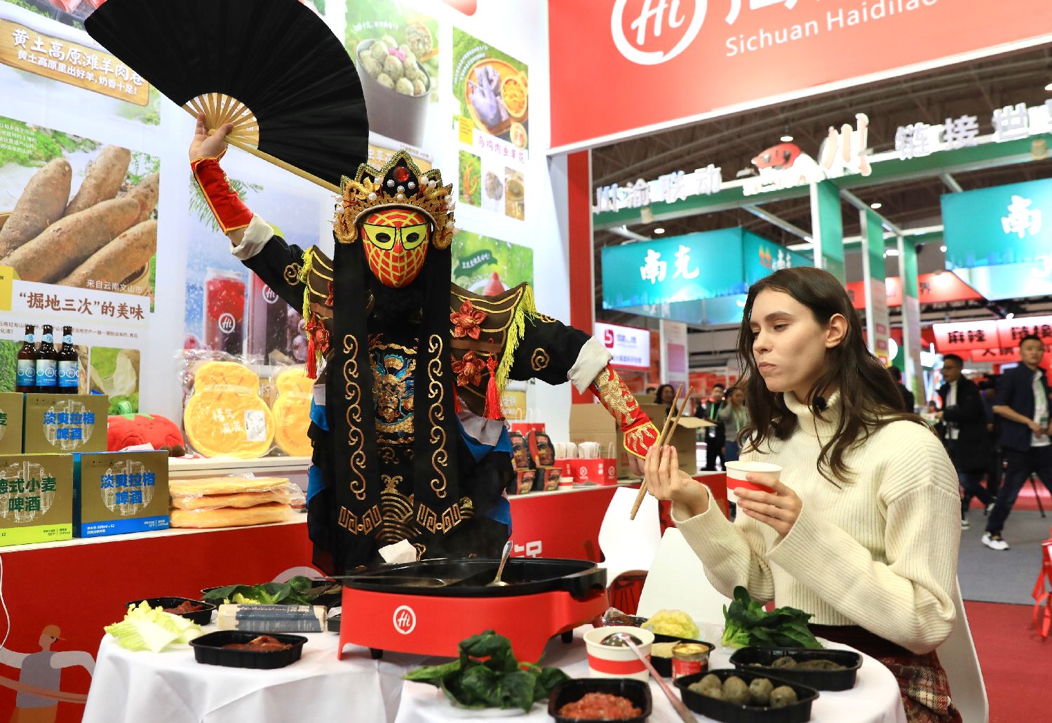 2024年11月26日,第二届中国国际供应链促进博览会的中国(川渝)火锅产业供应链专题展区,一位加拿大观众现场体验火锅味道。(图/中新社)
