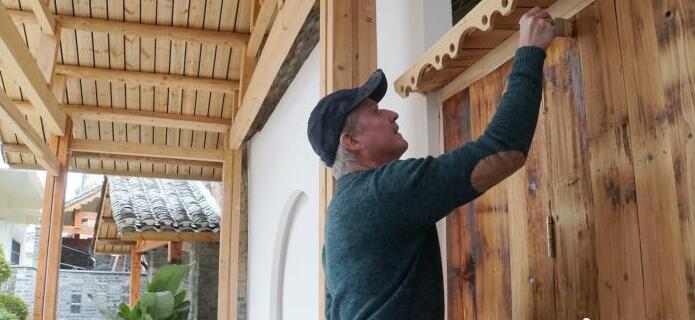 在广西阳朔遇龙堡村,伊恩正为民宿的木门上漆。(图/中新网)