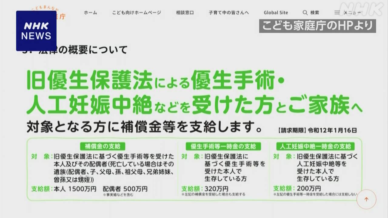 关于旧优生保护法,2024年7月日本最高法院判决认定该法中关于优生手术的规定违反宪法。受此判决影响,日本政府于2024年10月通过了新的补偿法案,以向受害者提供赔偿。根据新法,凡依据旧优生保护法被强制实施绝育手术的受害者本人,将获得1,500万日元补偿金;配偶可获得500万日元补偿。此外,被强制进行人工流产手术的受害者本人,可获得200万日元一次性补偿金。根据儿童家庭厅的估算:接受绝育手术的受害者及其遗属约2.5万人,配偶及其遗属约7,600人,接受人工流产手术的受害者约1.5万人。政府预计本次补偿总额将达约4,710亿日元。17日起,各都道府县窗口开始受理补偿申请。儿童家庭厅要求各都道府县向已掌握的受害者发送个别通知,以确保补偿落实。此外,政府还将:提供资金以支持地方政府向受害者发送个别通知;提供法律支援,安排律师协助受害者进行补偿申请。