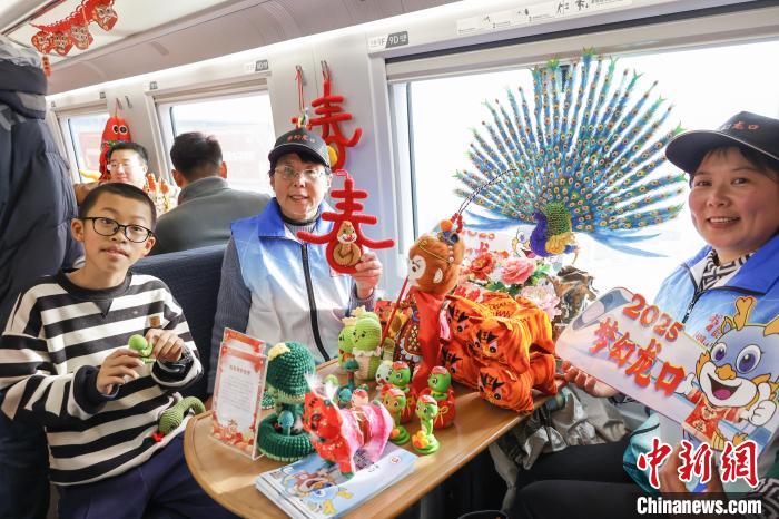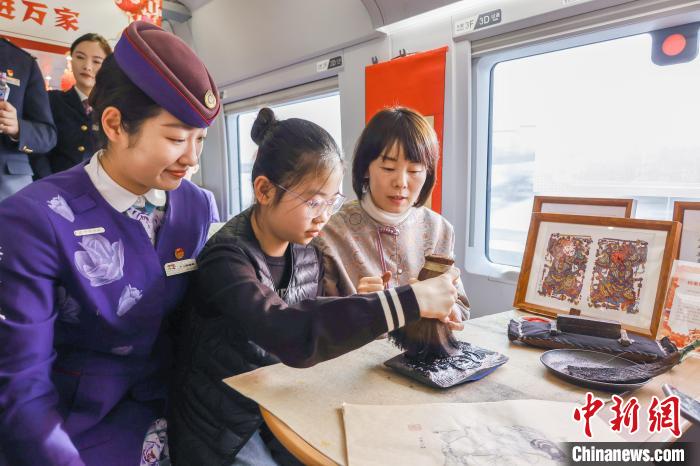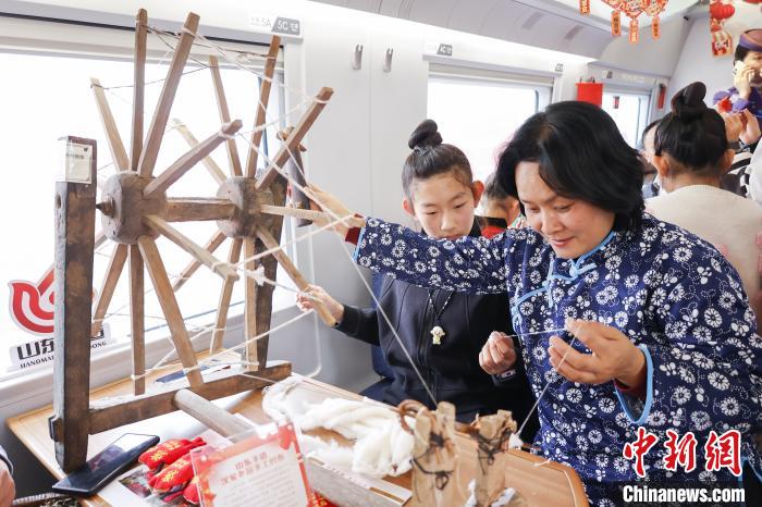 中新网青岛1月19日电(胡耀杰王禹)2025年蛇年春节,是申遗成功后的第一个春节。随着春运的到来,在疾驰的火车上,非遗成为一道亮丽风景线,为旅客们的归家之路增添了别样的文化韵味。