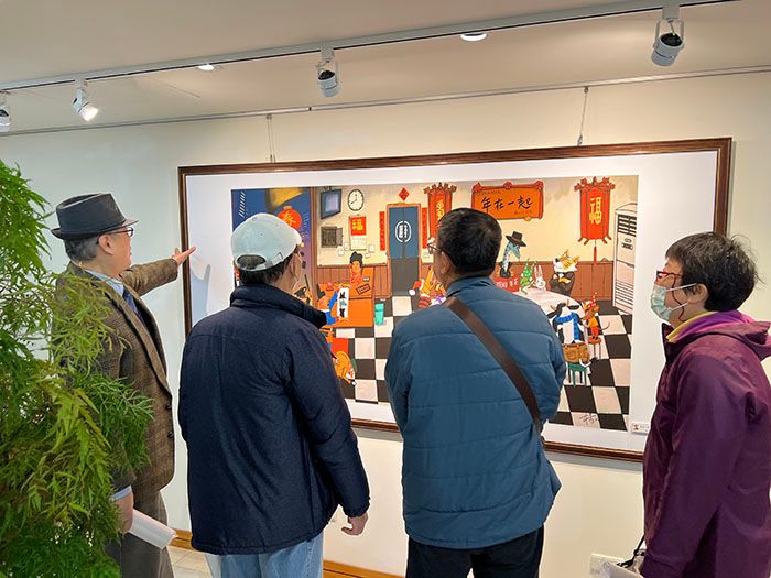 1月18日,“2025‘年’在一起 两岸春联年画漫画展”在台北江山如此多娇艺术馆开幕,民众在现场欣赏展出的漫画作品《年夜饭》。(图/中新社)