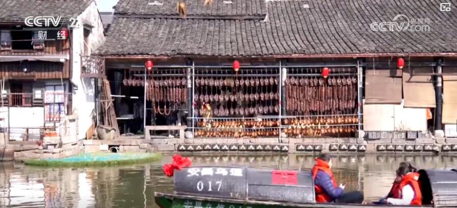 浙江绍兴柯桥的安昌古镇素有制作腊肠酱鸭的传统,腊月时节,这里的店铺挂满色泽诱人的酱货。(图/中国央视财经视频截图)
