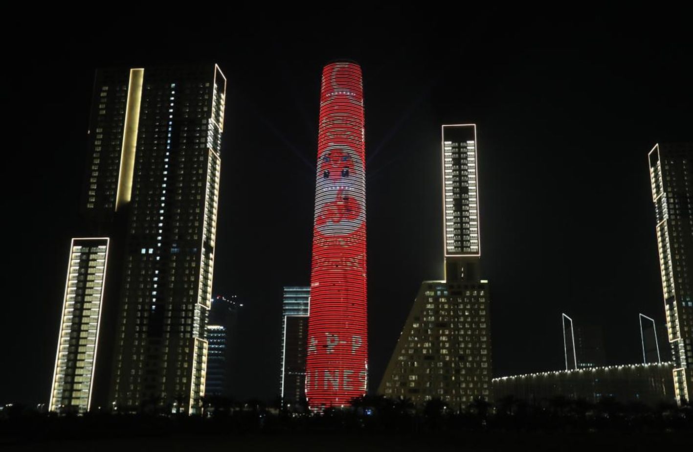 这是1月19日在埃及新行政首都中央商务区拍摄的被点亮的“标志塔”。当地时间当晚,由中国建筑股份有限公司埃及分公司承建的埃及新行政首都中央商务区项目上,被誉为“非洲第一高楼”的“标志塔”被灯光点亮,迎接中国新年。(新华社)