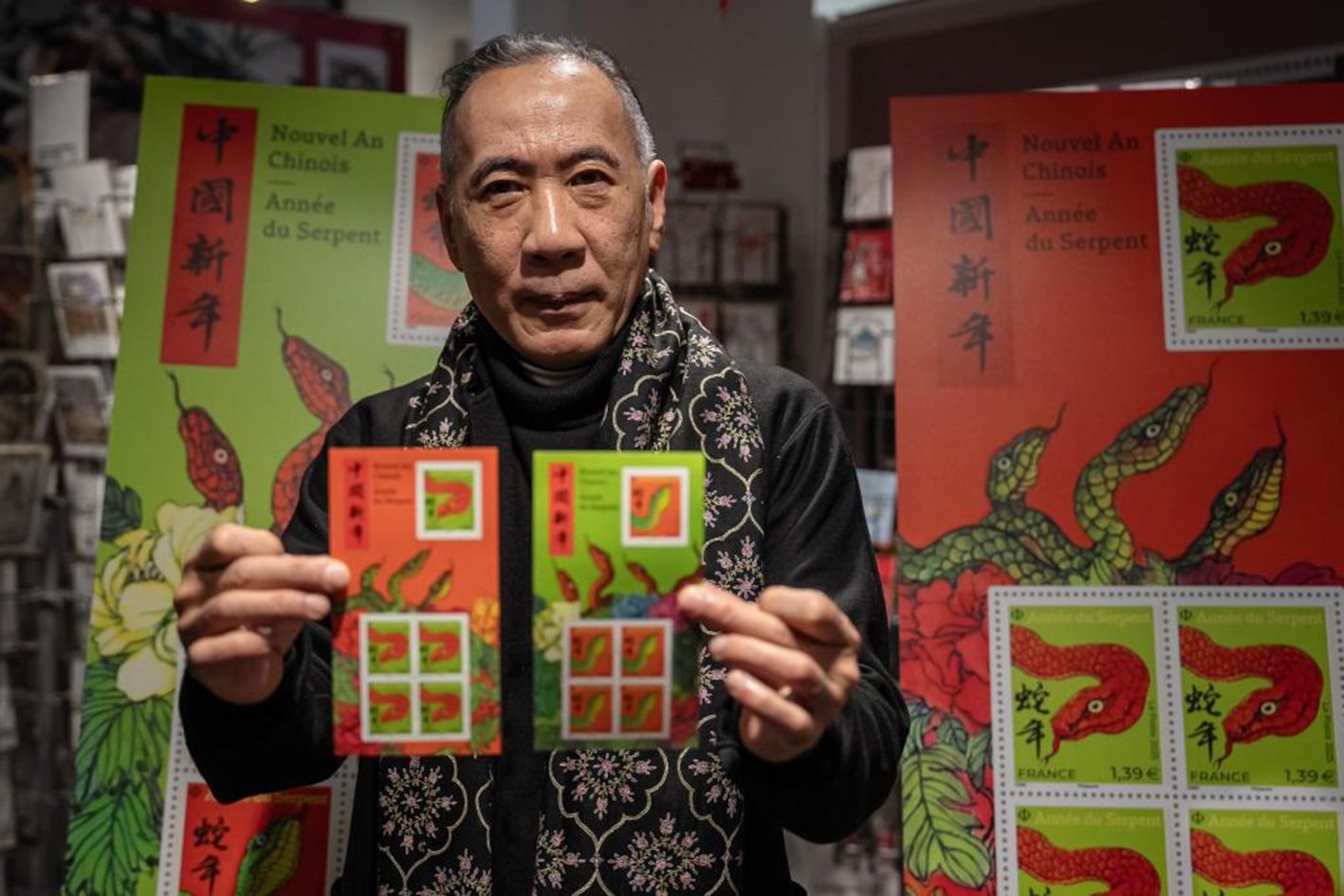 1月18日,在法国巴黎举行的蛇年生肖邮票发行仪式上,设计者华人艺术家陈江洪展示蛇年生肖纪念邮票。为迎接中国农历新年,法国邮政集团18日在首都巴黎举行中国农历蛇年生肖纪念邮票发行仪式。(新华社)