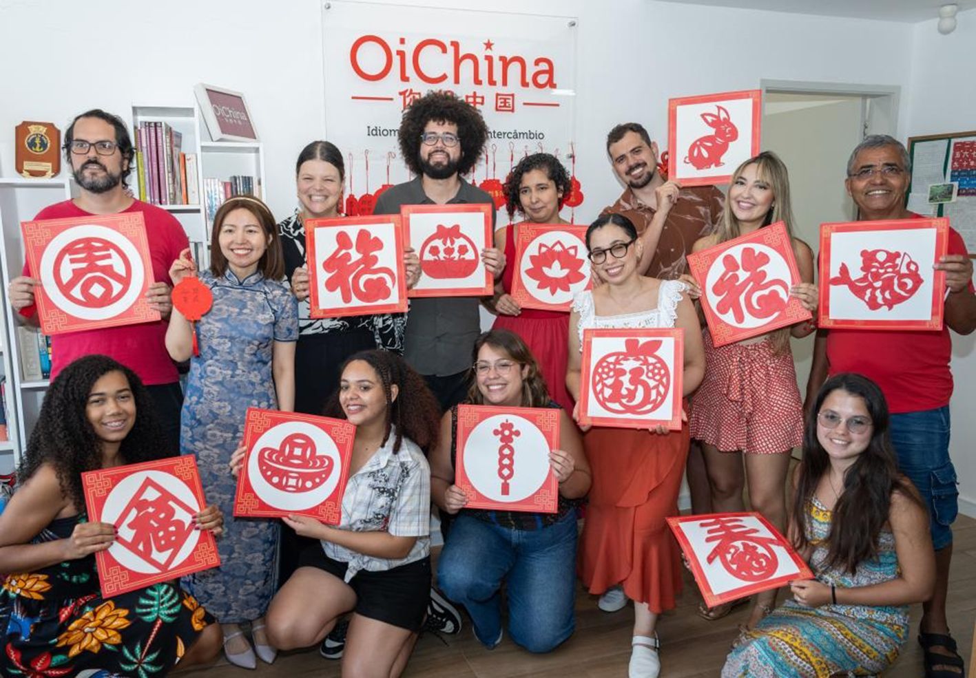 1月18日,人们在巴西里约热内卢举行的中国春节文化体验活动上展示他们一起制作的剪纸。(新华社)