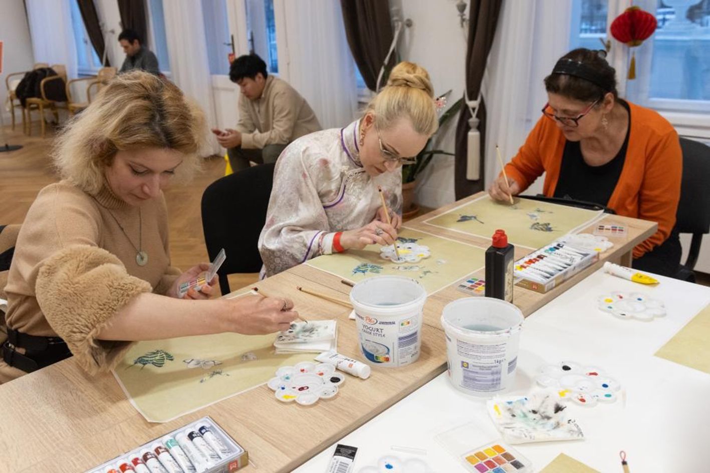 1月17日,在匈牙利布达佩斯,人们在“指尖上的非遗——中国文化体验日”为主题的2025“欢乐春节”活动上体验中国绘画。(新华社)