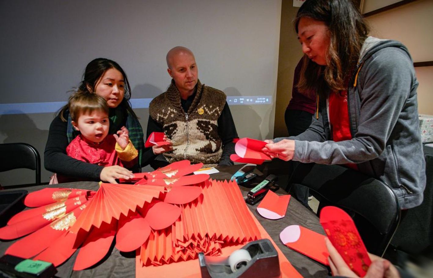 1月18日,人们在加拿大温哥华举行的中国春节文化体验活动上学习制作春节装饰品。(新华社)