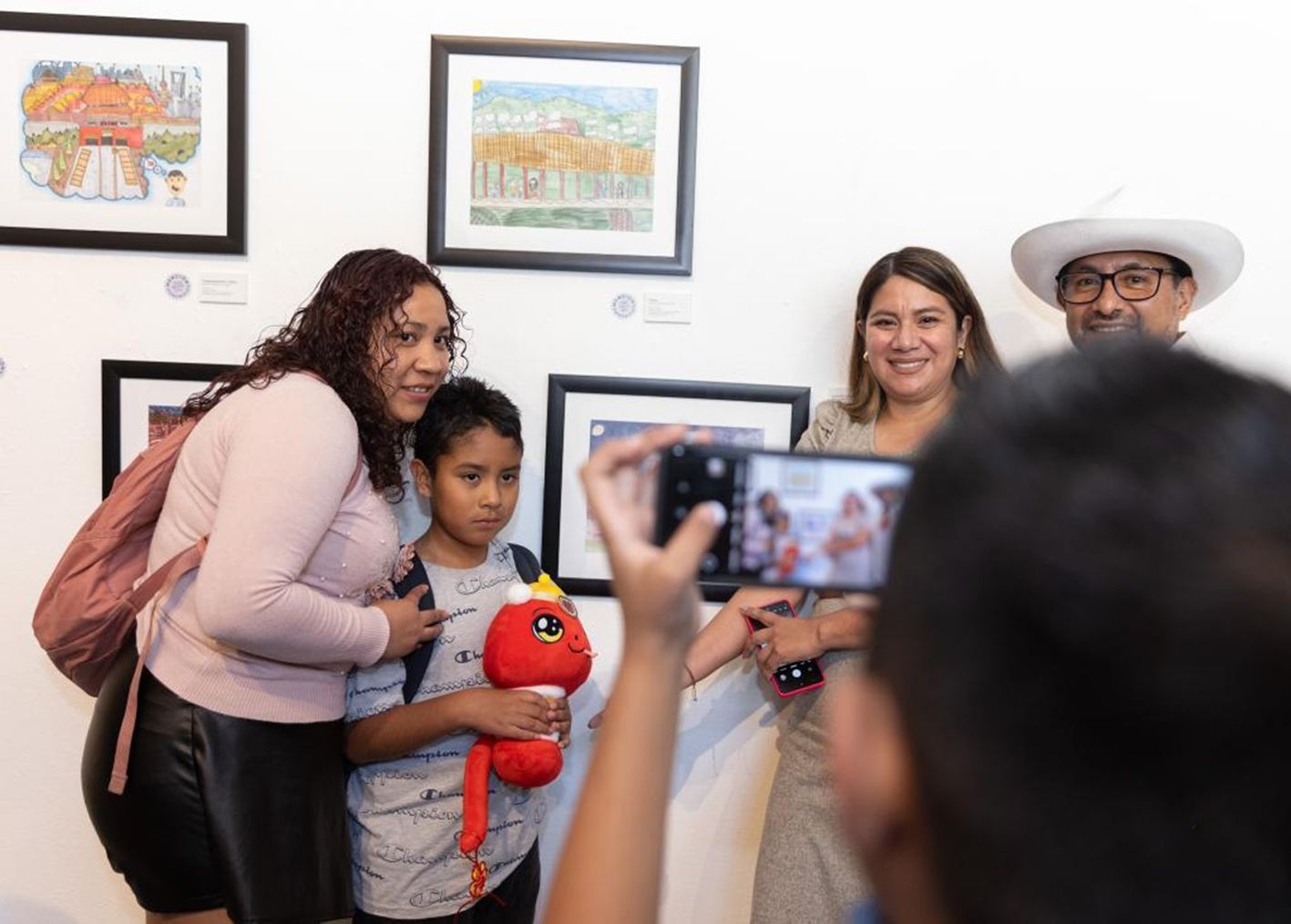 1月18日,在墨西哥首都墨西哥城举行的第十一届“我想象中的中国”儿童绘画比赛活动上,参赛者和家人手拿蛇年春节玩偶在画作前留影。(新华社)