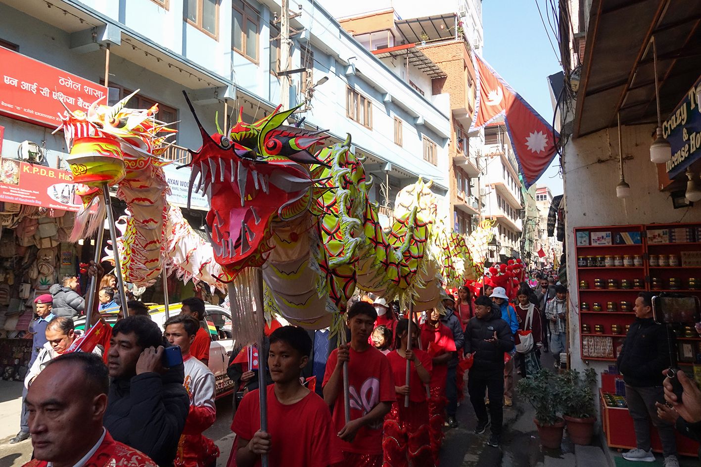 1月19日,2025中国新年巡游活动在尼泊尔加德满都各国游客聚集的泰米尔区举行。来自中尼两国的文艺表演者、尼泊尔华侨华人协会及在尼中资企业代表、当地民众欢聚一堂,共同参与巡游活动。图为新春巡游队伍行经泰米尔区街巷。(中新社)