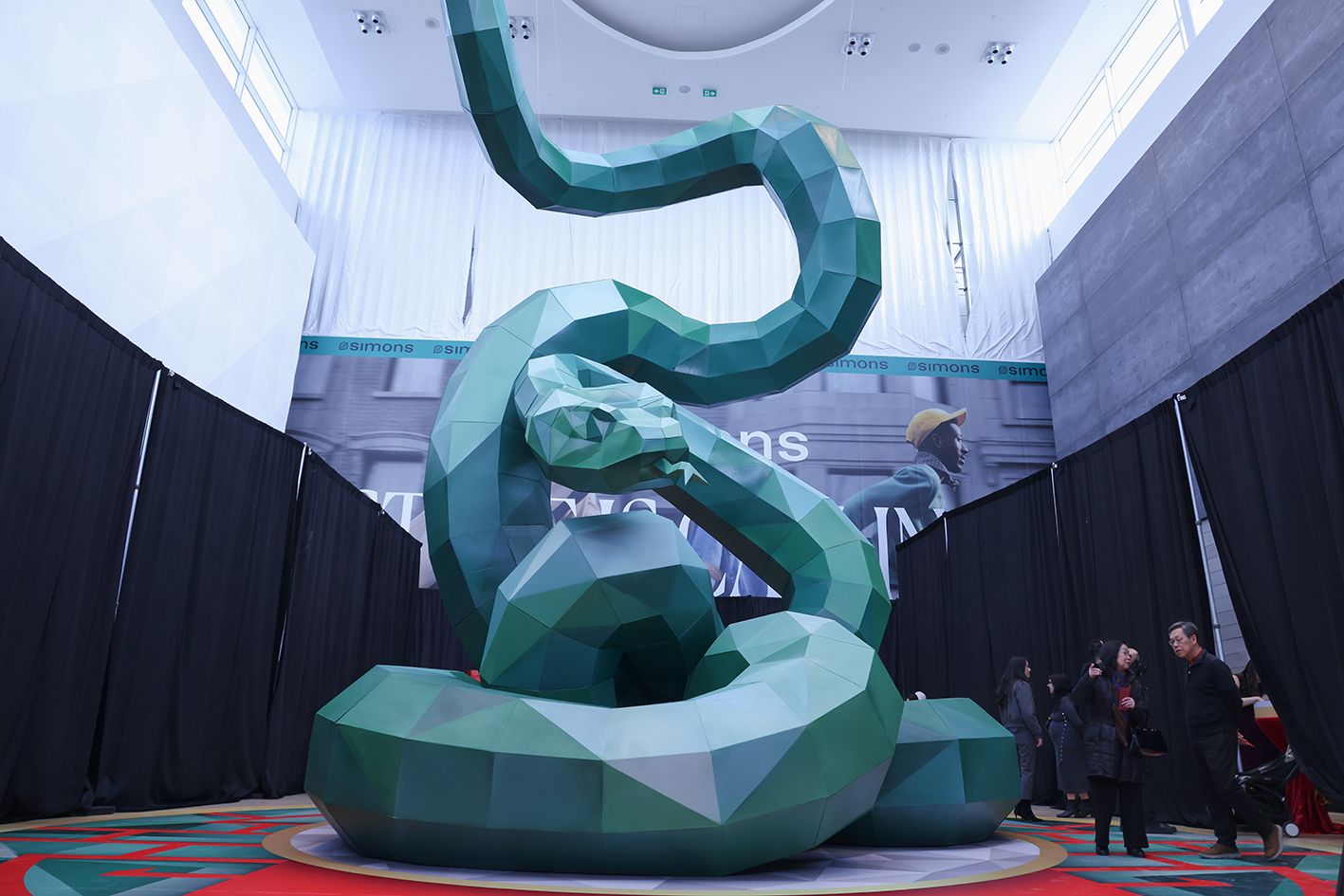 1月17日,加拿大多伦多,一条30英尺(约合9.14米)高、20英尺(约合6.1米)宽的巨型青蛇在知名大型商场约克戴尔(Yorkdale)购物中心揭幕,以迎接即将到来的农历乙巳蛇年新春。(中新社)