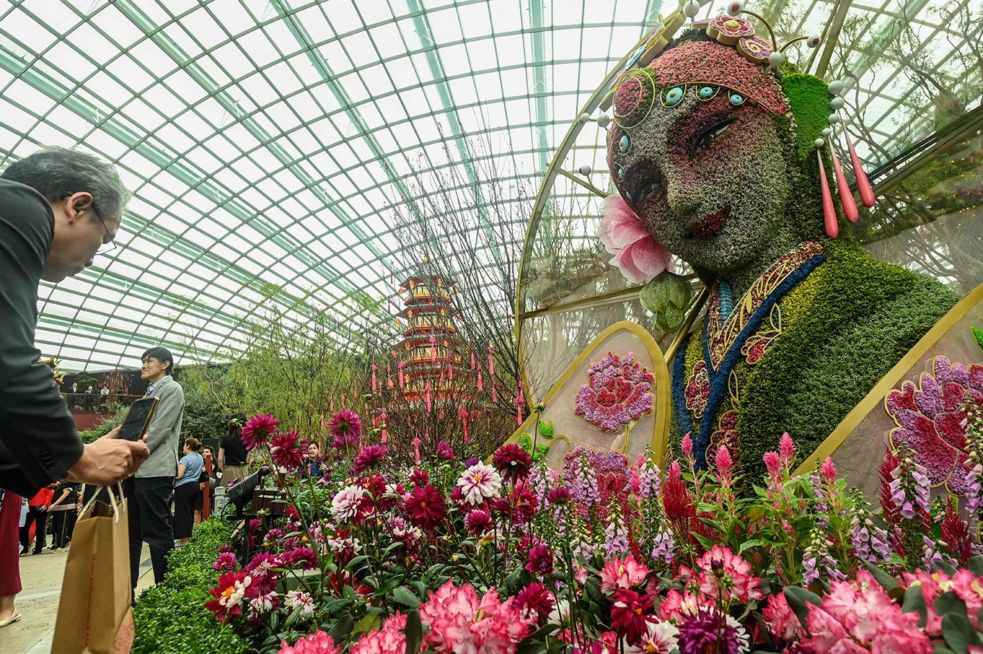1月17日,新加坡滨海湾花园的春节主题花卉展览中,游客在一座高大的花卉雕塑“白蛇传”展品前摆姿势拍照。(CFP)