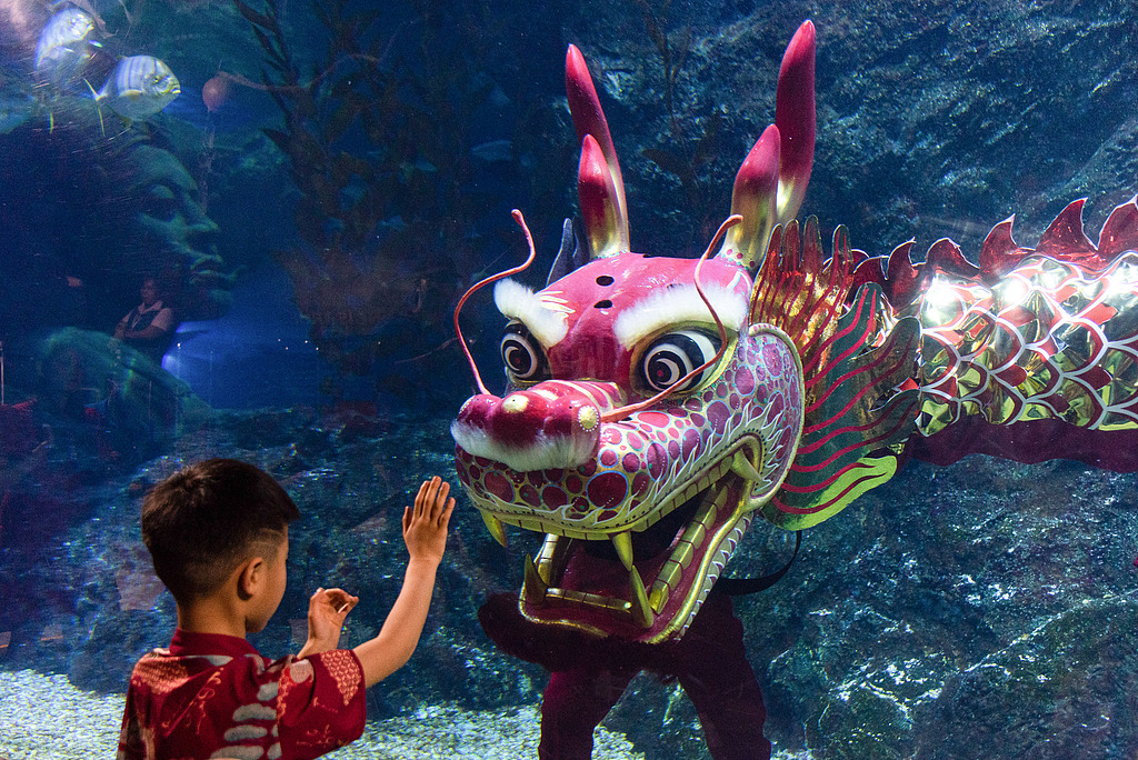 新春将至,在华人众多的东南亚,“新”年味也越来越浓。位于泰国曼谷的暹罗海洋世界近日开启迎新年活动,4名潜水员在鲨鱼和其他鱼类的包围下表演“水下舞龙”,还与水箱外的舞狮表演互动。游客们被这场创新的表演吸引,纷纷驻足拍照。有游客感叹道:“我去过很多水族馆,但没有一个有这样的文化活动,水下舞龙非常有创意。”一名潜水员表示:“今年用于表演的龙与往年相比更长更大,为了让这次表演更加精彩,我们做了更多改进。”不只是泰国,新加坡圣淘沙海洋馆和印尼雅加达安科尔海洋世界同样开启了水下舞狮舞龙表演,迎接春节的到来。