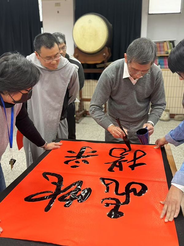农历春节前夕,孙永忠带领学生在台湾辅仁大学书写春联。(图/中新社)