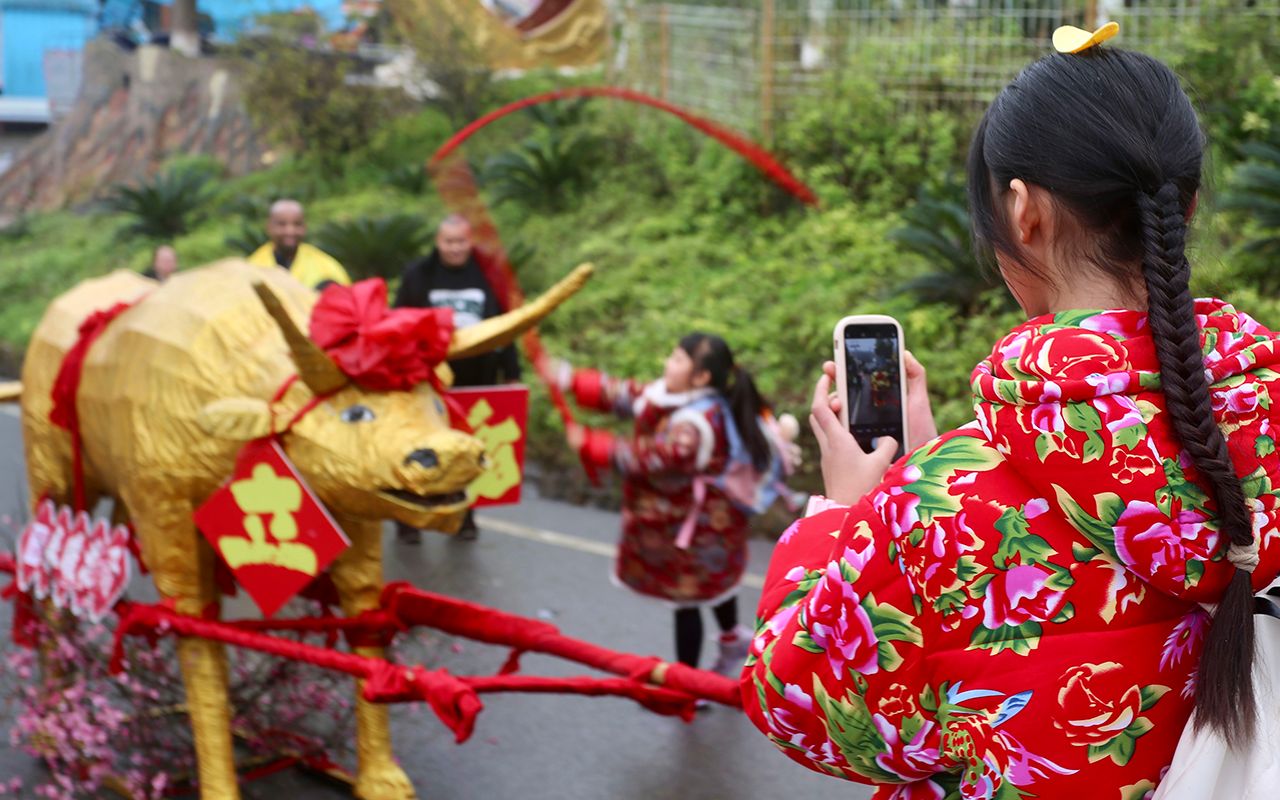 3日是中国传统节气立春,中国各地纷纷开展各具特色的活动,喜迎新春的到来。图为2月2日,重庆涪陵美心红酒小镇举行了一场“打春牛”迎立春民俗巡游活动,吸引众多游客一起“打春牛、讨彩头”。(中新社)