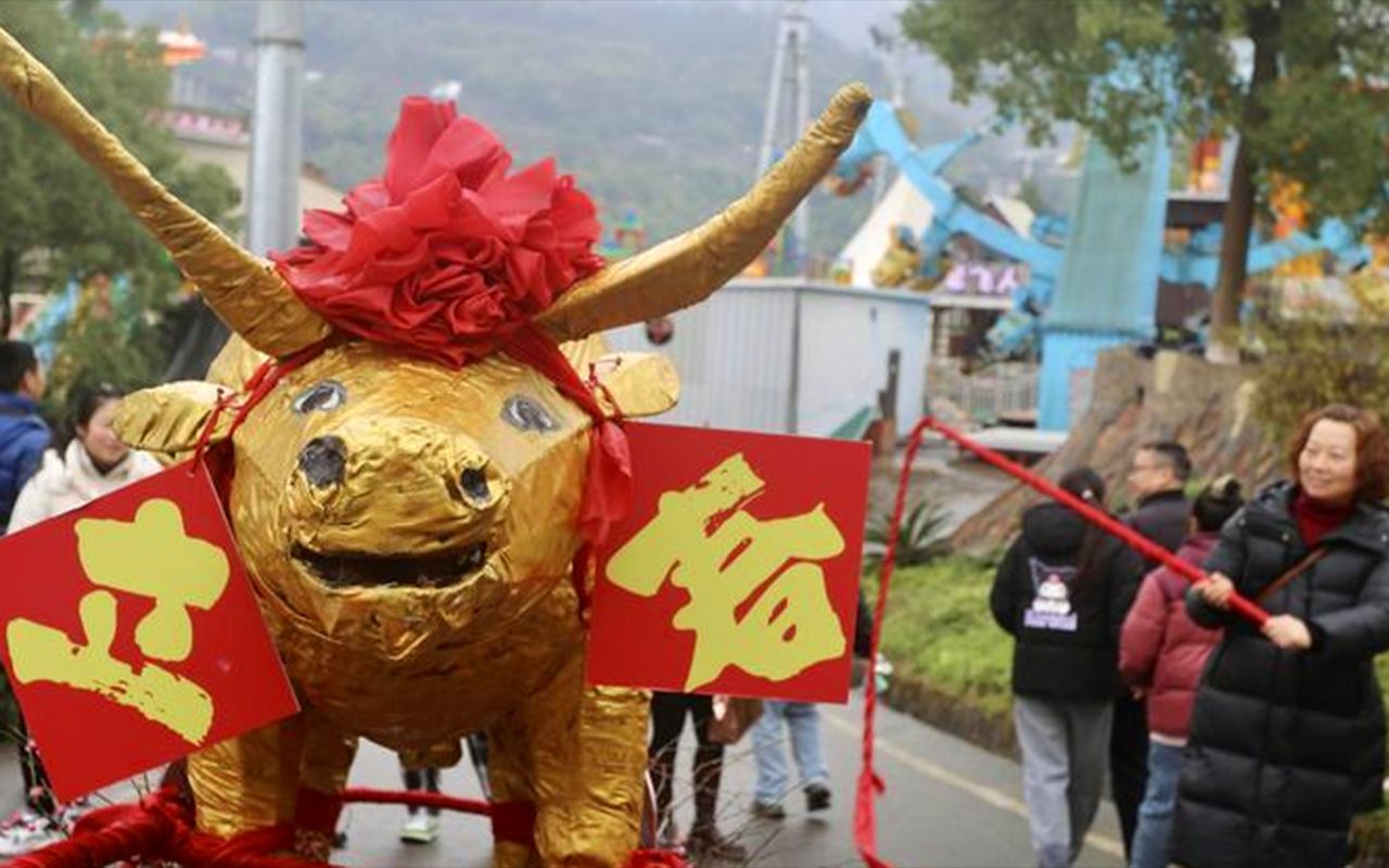 图为2月2日,上海徐汇,“海上最春早”乙巳立春游园会活动现场的“鞭春牛”仪式。(上海东方网)