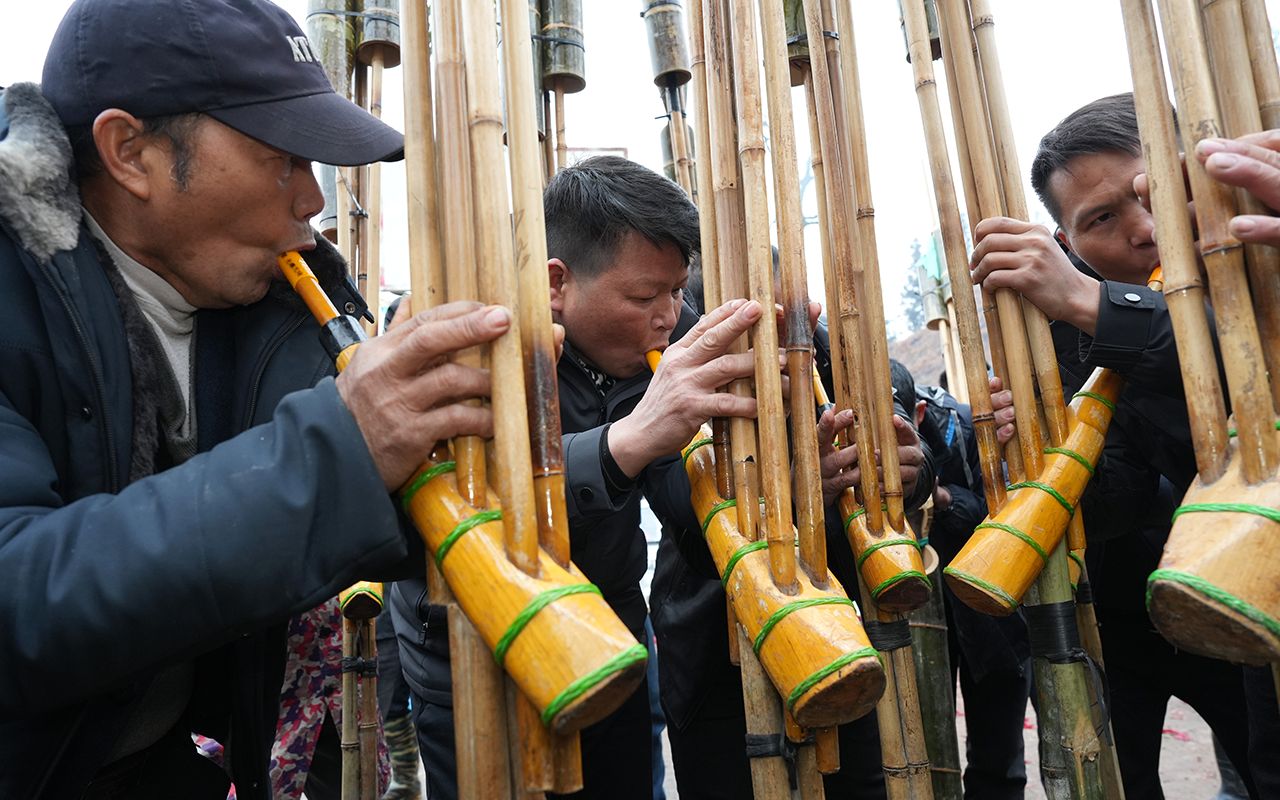 图为2月2日,广西融水苗族自治县拱洞乡培基苗寨举行芦笙节活动迎“立春”,村民吹奏芦笙。(CFP)