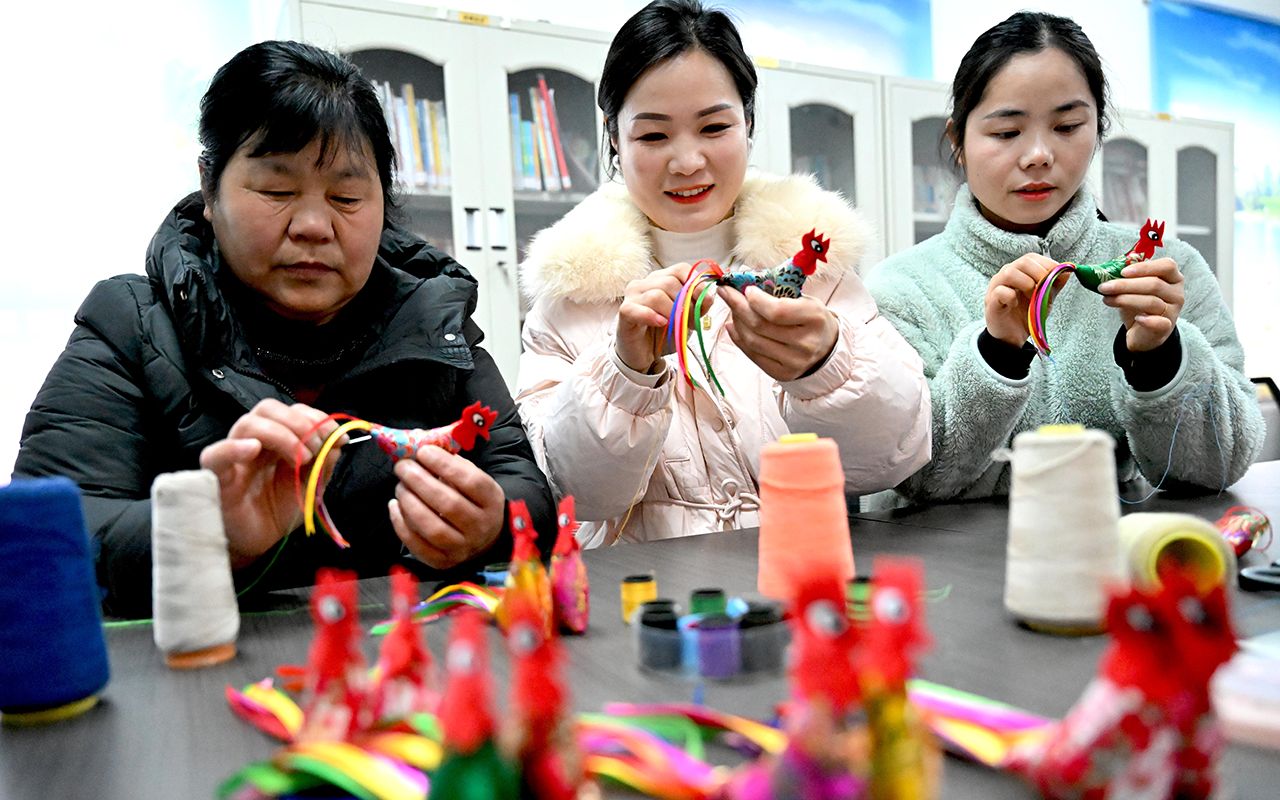 图为2月2日,安徽亳州,利辛县孙集镇刘营社区,村民在缝制“春鸡”迎立春。(CFP)
