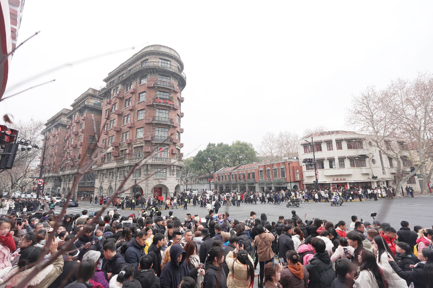 2月2日,正值春节假期,上海武康大楼吸引众多游客。路口处,人们争相占据最佳拍摄点,与这座拥有百年历史的建筑合影留念。(图/中新社)