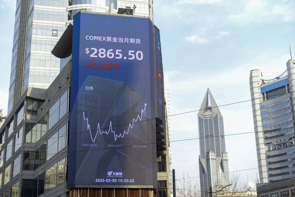 5日,上海大屏幕显示纽约商品交易所黄金当月期货升至2865.50美元/盎司。(IC Photo)