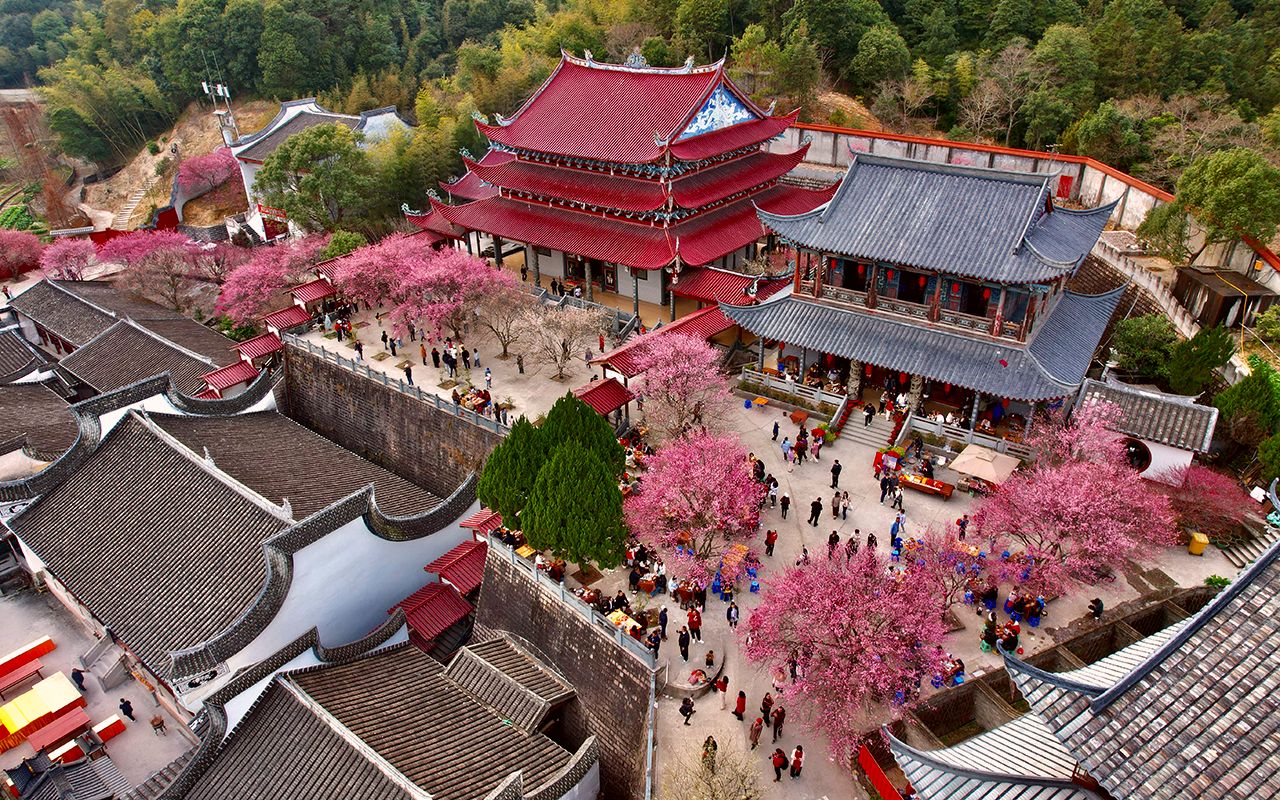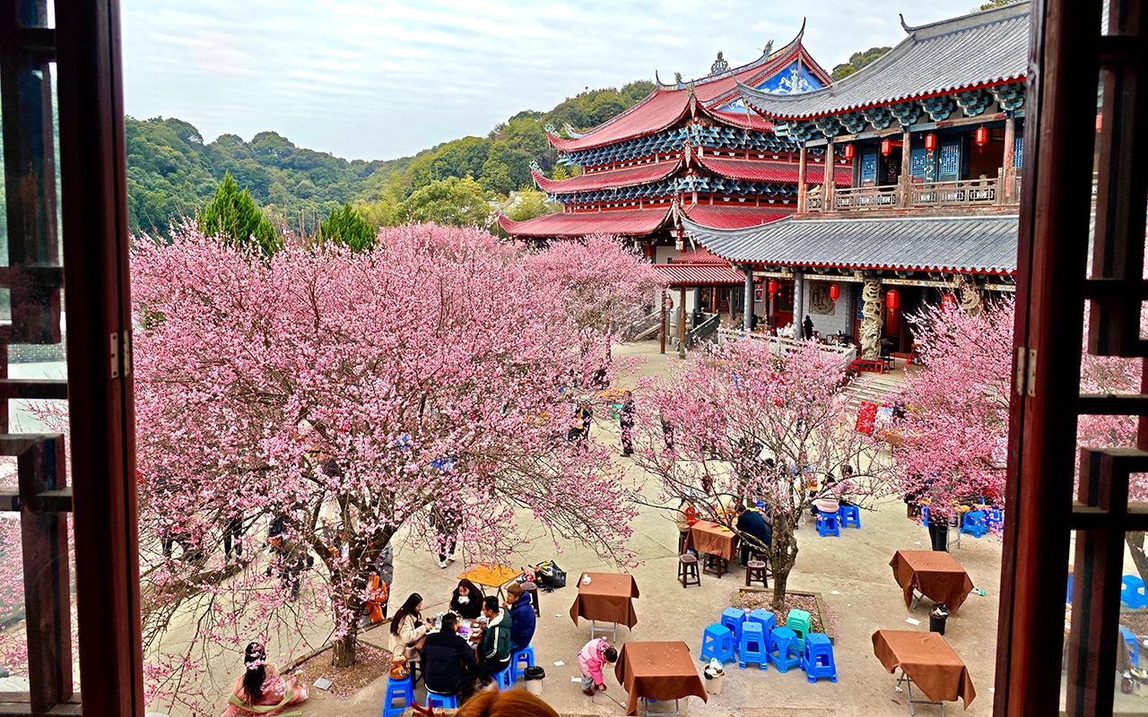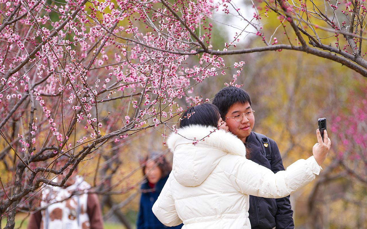 初春之期,中国各地花开争艳,天地满芳菲,处处浪漫美景引游人。图为2月5日,福建福州,林阳寺的梅花盛开吸引游客来此赏花。(中新社)