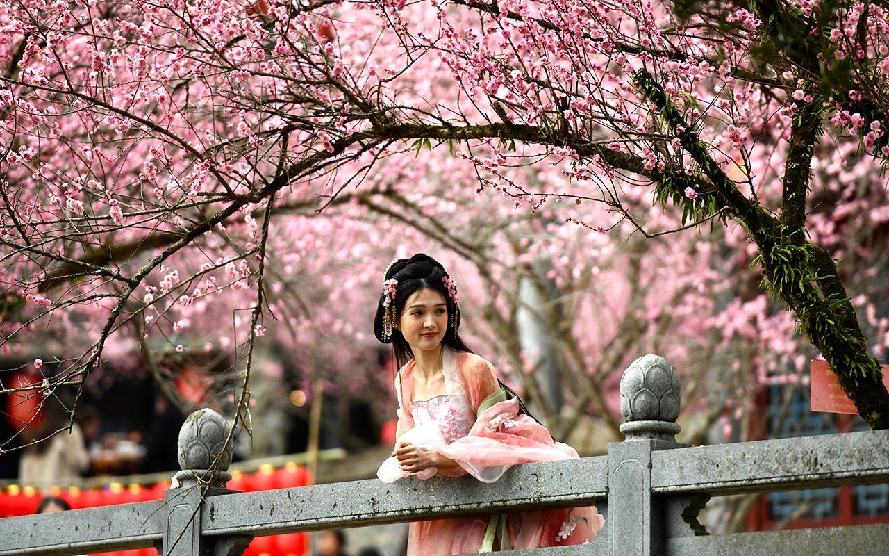 图为2月5日,福建福州,身着古装的游客在林阳寺梅花丛中留影。(中新社)