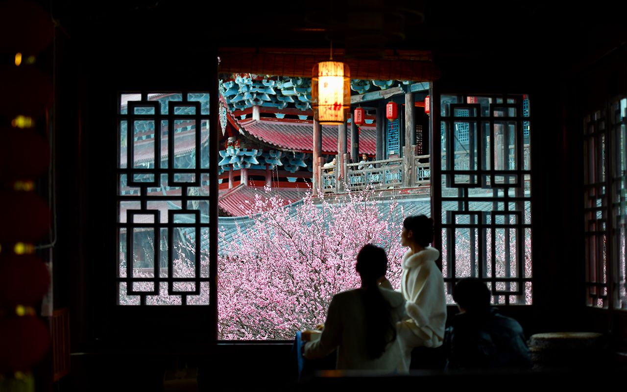 图为2月5日,福建福州,游客林阳寺窗前赏花。(中新社)