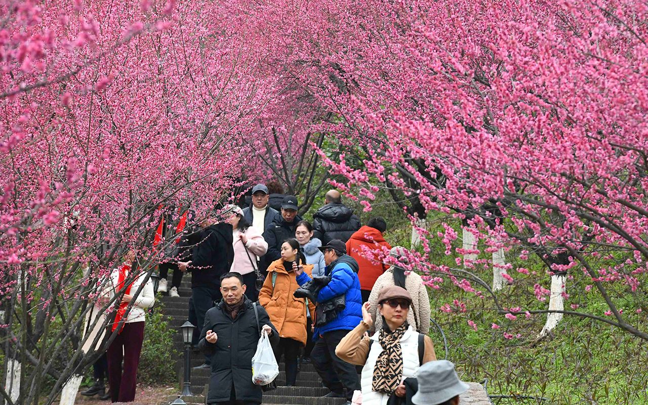 图为2月5日,重庆市沙坪坝区歌乐山红岩景区内大面积红梅纷纷绽放,漫山的红梅芳香扑鼻,吸引游客前往赏花。(中新社)