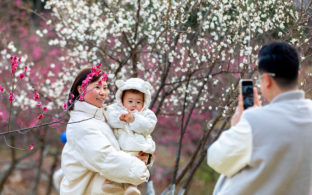图为2月5日,湖北武汉东湖梅园内梅花竞相绽放,市民与游客在东湖梅园里散步、赏花。(中新社)