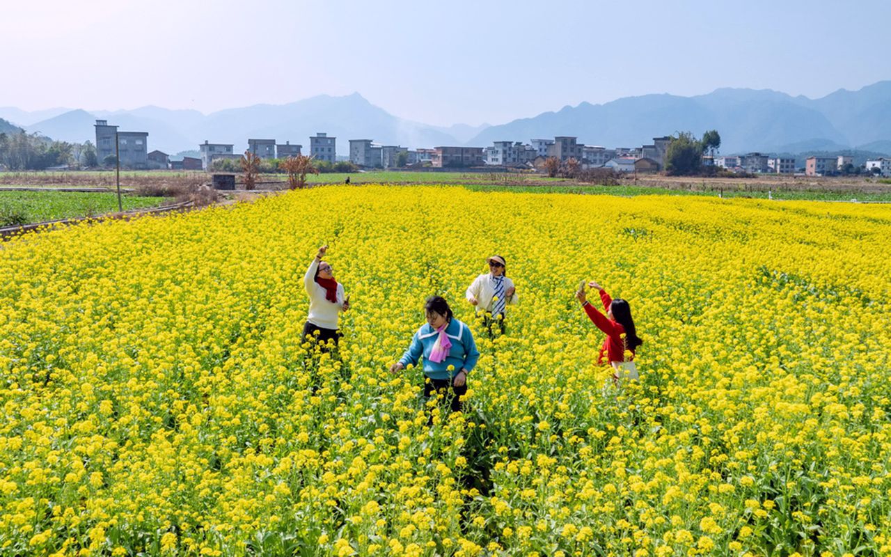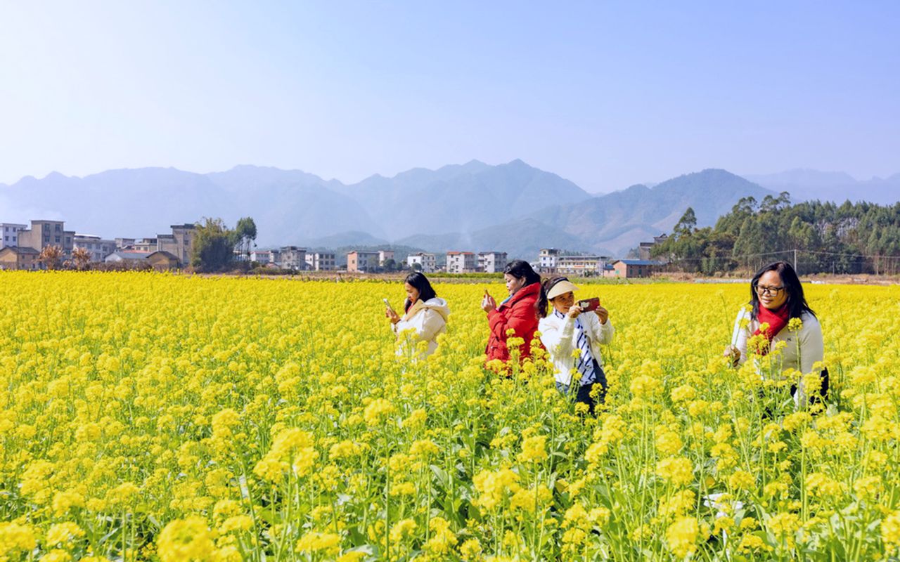 图为2月4日,广西梧州市蒙山县新圩镇新圩村的千亩蔬菜基地菜花盛开,市民花丛中游玩打卡。(人民网)