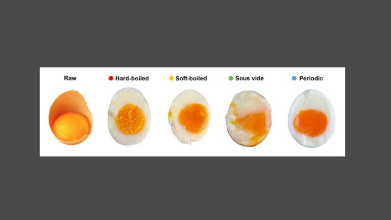 研究团队基于流体力学模拟了鸡蛋内部温度的变化及其随时间的变化趋势,并最终提出了“周期调理”方法。该方法总耗时32分钟,期间将鸡蛋在沸水锅和30度的水碗中交替浸泡16次,随后用流水冷却。实验结果表明,在此过程中,蛋白的温度在35~100度之间变化,而蛋黄温度则被稳定保持在约67度。