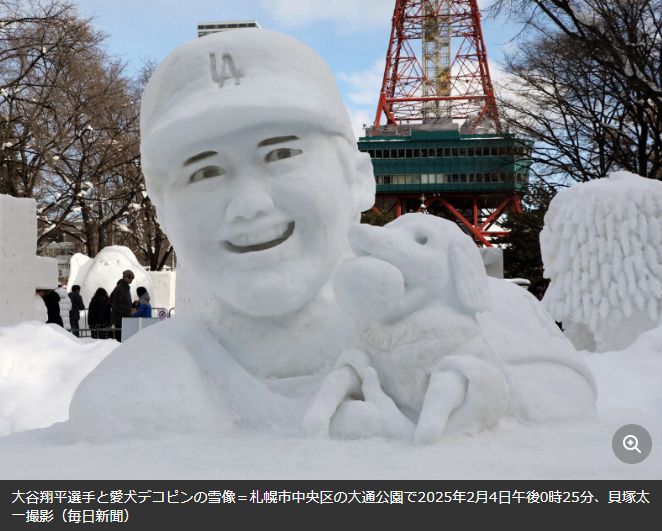 札幌雪祭近日正在北海道札幌举办,今年一座仿照美国职棒大联盟(MLB)洛杉矶道奇队球星大谷翔平与其爱犬“Decopin”制作而成的巨型雪雕格外引人注目。