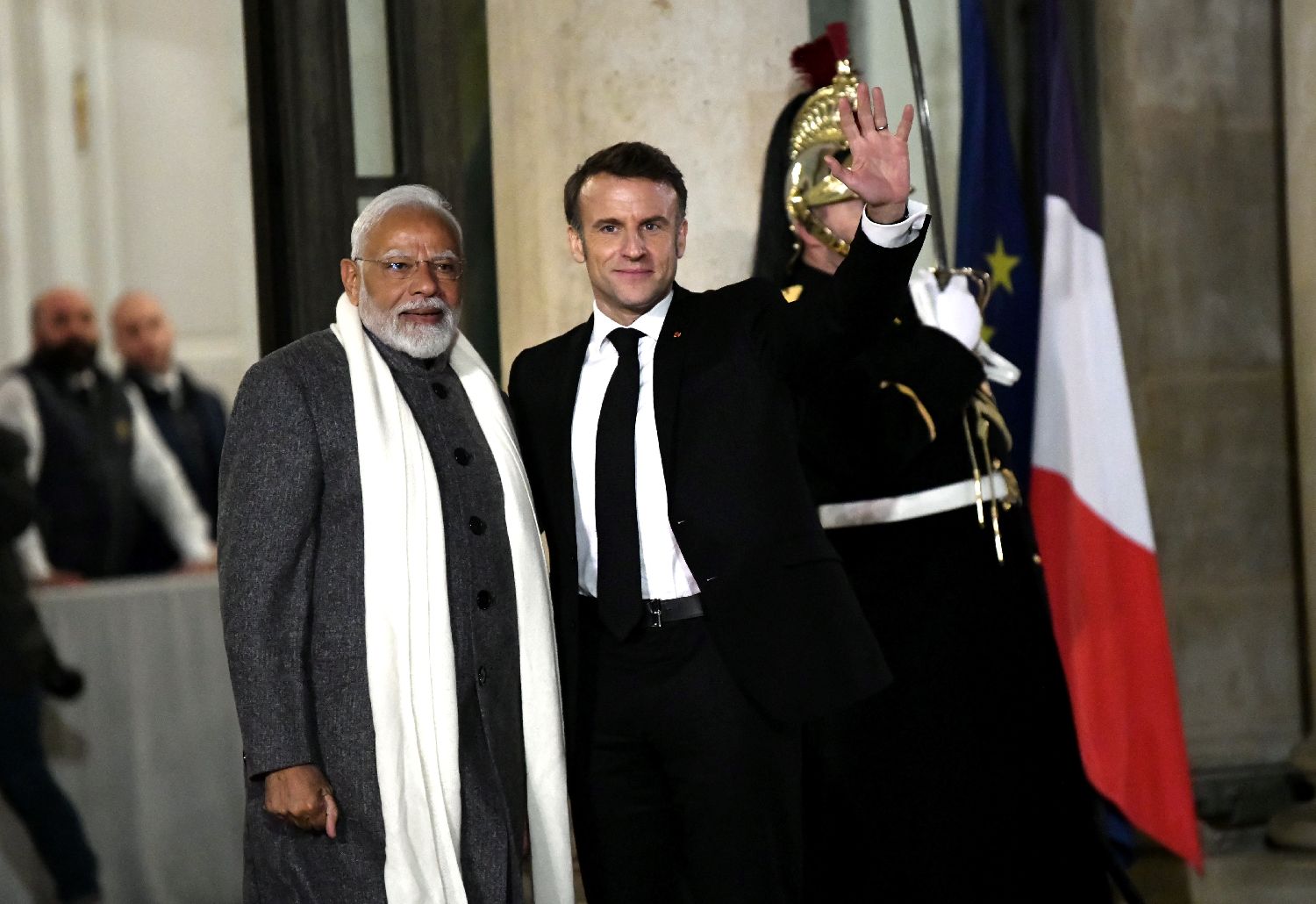 图为法国总统马克龙当地时间10日晚在巴黎欢迎前来出席峰会的印度总理莫迪。本次峰会由法国倡议召开,印度是峰会的共同主席国。(图/中新社)