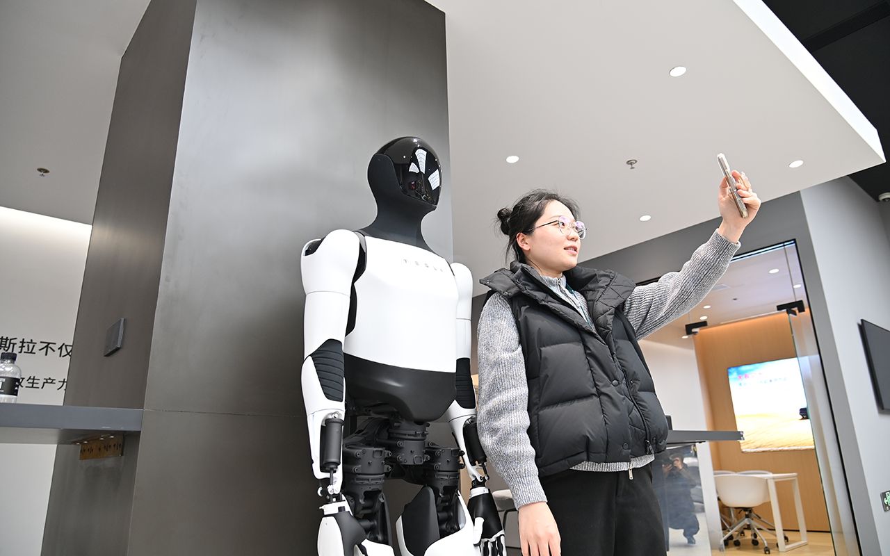 重庆龙湖高新天街特斯拉体验店,市民与特斯拉人形机器人合影。(CFP)