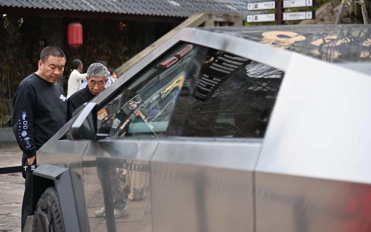 图为特斯拉赛博越野车等车型亮相磁器口古镇,赛博越野旅行车吸引游客目光。(CFP)