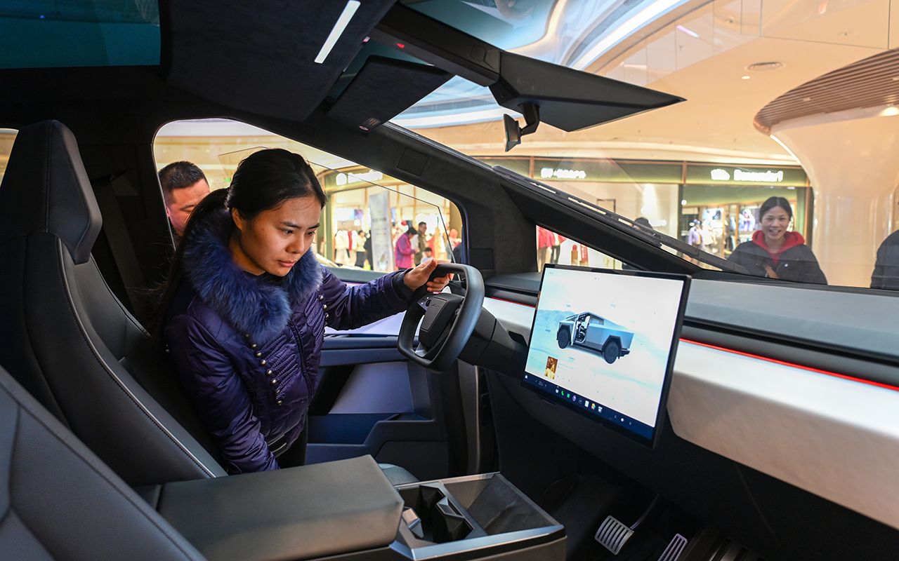 在湖北省襄阳市,一辆特斯拉赛博越野旅行车(俗称皮卡车)在一家购物中心巡展亮相,吸引了人们围观。(CFP)