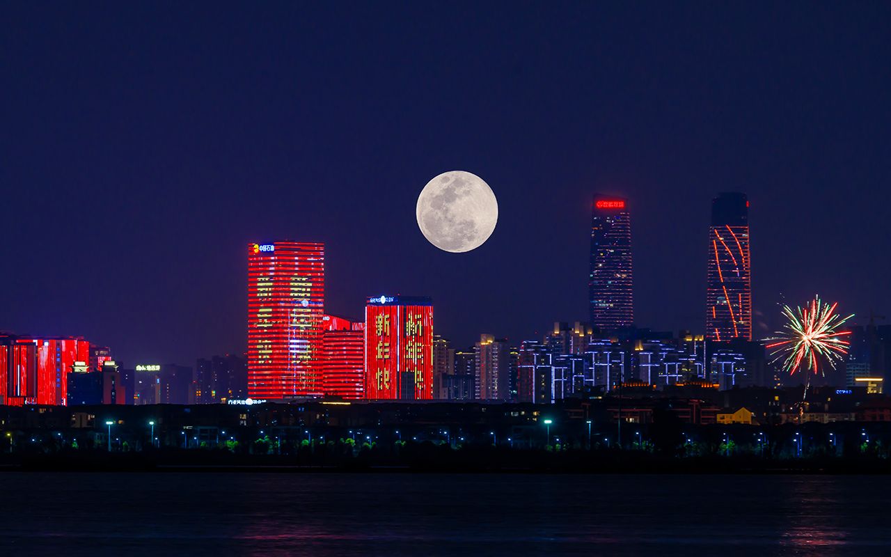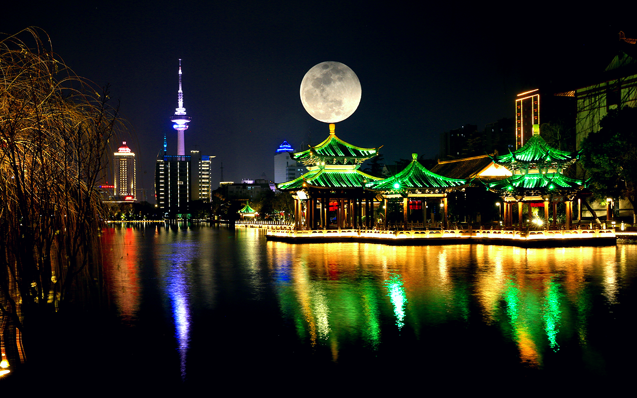 图为2月12日,江苏南通,恰逢年度最小满月,一轮明月在濠河风景区上空高高挂(多次曝光)。(CFP)
