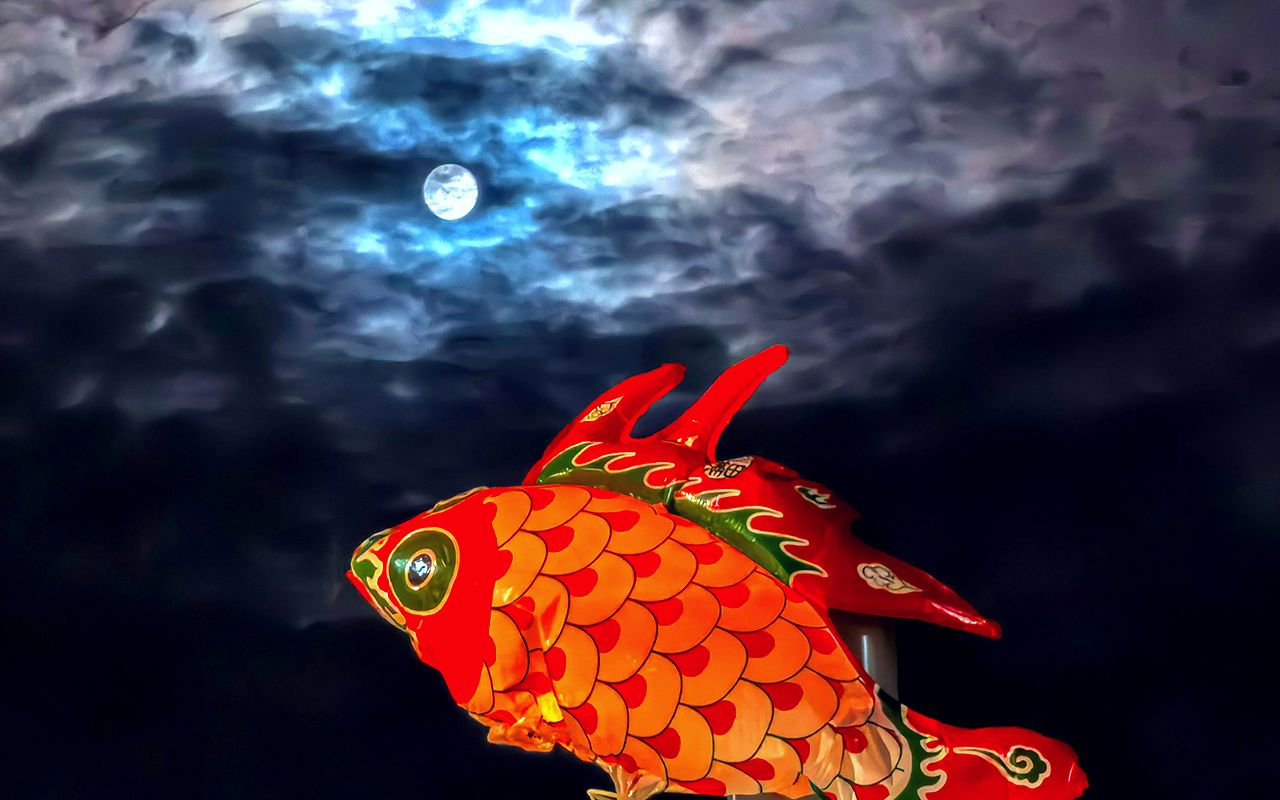 图为2月12日,元宵节晚,安徽省淮北市夜空满月与鱼灯交相辉映,为市民增添了一份诗意与浪漫。(CFP)