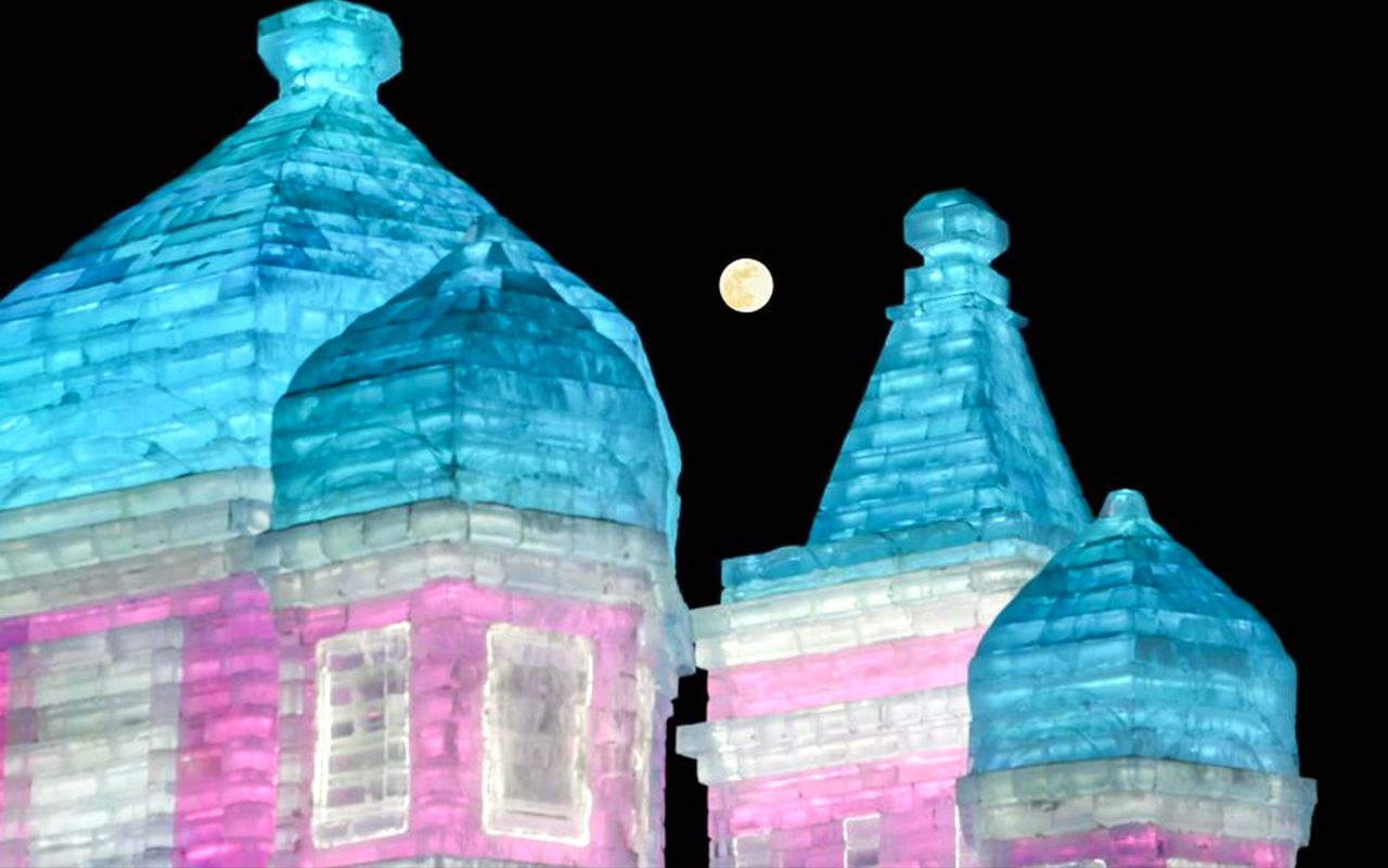 图为2月12日在黑龙江哈尔滨冰雪大世界拍摄的月亮。(新华社)