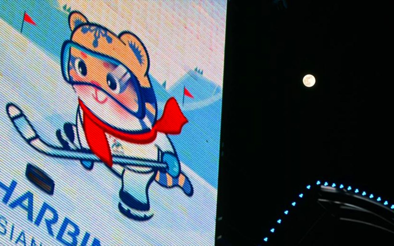 图为2月12日,元宵佳节,圆月高悬,银辉洒满大地,亚冬之城哈尔滨在此刻熠熠生辉,一轮圆月从亚冬会主火炬上升起。(新华社)