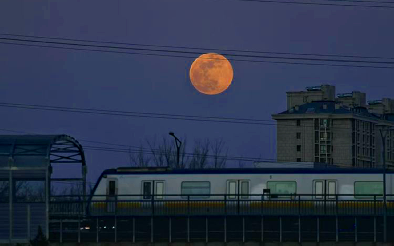 图为2月12日,十五的圆月缓缓升起,北京北四环,城际列车驶过刚升起的满月。(北京《新京报》)