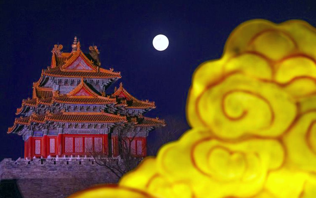 图为2月12日,北京,圆月与故宫角楼同框(二次曝光)。(北京《新京报》)