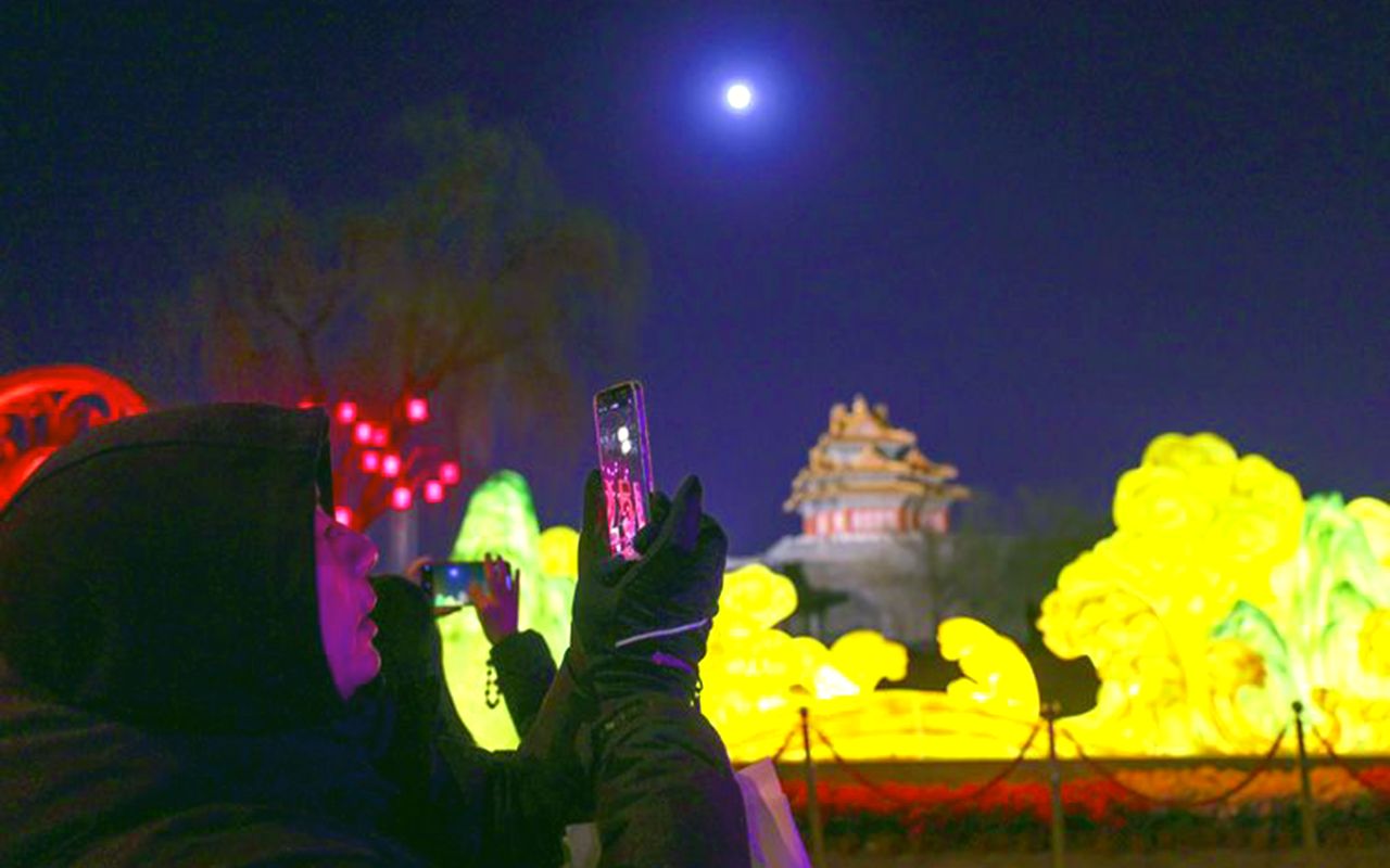 图为2月12日,北京,市民在故宫筒子河畔拍摄满月。(北京《新京报》)