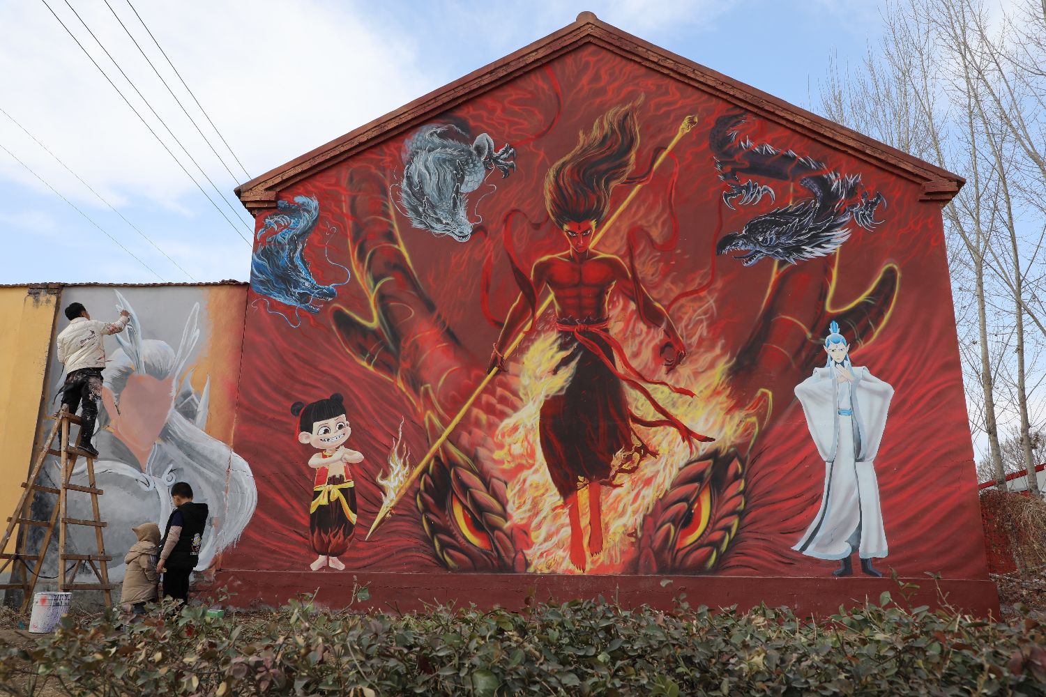 2月12日,山东淄博周村区沈家村,一幅高10米、宽8米的哪吒墙绘走红。该墙绘由当地“90后”墙绘师沈靖宇手绘完成。(图/中新社)